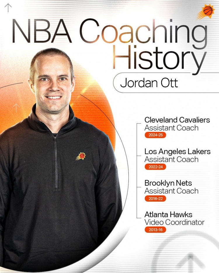 乔丹-奥特现年40岁,和太阳老板伊什比亚是密歇根州立大学的校友,他曾在老鹰担任视频协调员,在布登霍尔泽手下开始自己的教练生涯,之后还曾在篮网(阿特金森、沃恩手下)、湖人(哈姆手下)以及骑士(阿特金森手下)担任过助教。