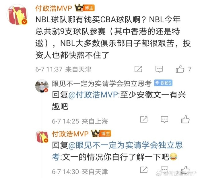 6月10日讯 今天,媒体人付政浩在社媒上谈到了NBL俱乐部安徽文一,表示这支球队这两天被传出解散的传闻。