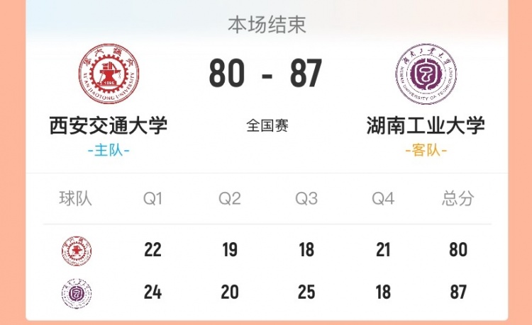 末节决战,双方命中率都有下降,但西安交大追分湖南工大始终能回应,并保持住10分左右领先。王俊继续内线强打止血,刘治宪抢断后也助胡耘逍快攻追分,但柳锐站出来止血,杨李杰二次进攻打成还是保持两球以上领先。最后时刻王俊三分追到差4分,但无奈时间所剩无几,柳锐两罚全中后再抢断杀死比赛,最终湖南工大87-80力克西安交大,拿到最后一张全国8强门票。