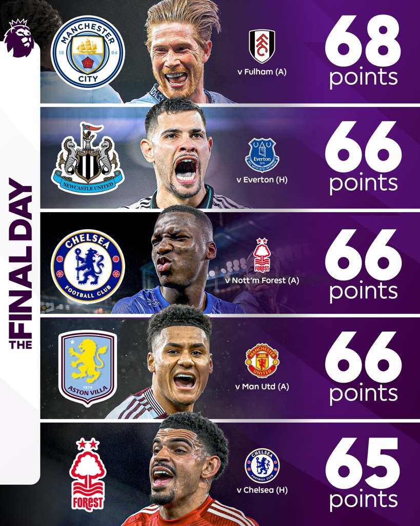英超第38轮将开启终极大戏:争五。5支队伍将争夺3个欧冠名额,末轮之前曼城68分,纽卡、切尔西和维拉均是66分,诺丁汉森林65分。