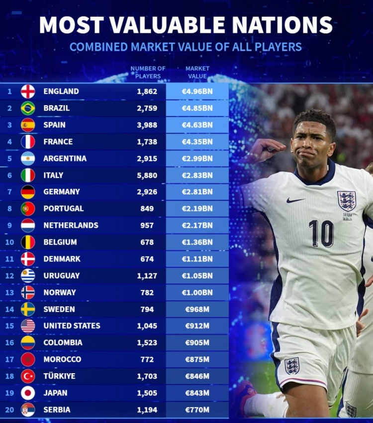 德转列各国球员总身价:英格兰49.6亿居首 巴西西班牙法国断层前4