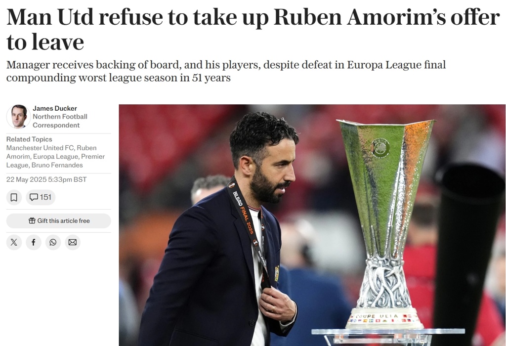 阿莫林曾在赛后公开表示,如果俱乐部希望换帅自己愿意离任,并且不需要任何金钱赔偿。《电讯报》表示,阿莫林其实一直都清楚,自己的未来不会受一场决赛的结果影响,也不取决于灾难般的处子赛季。