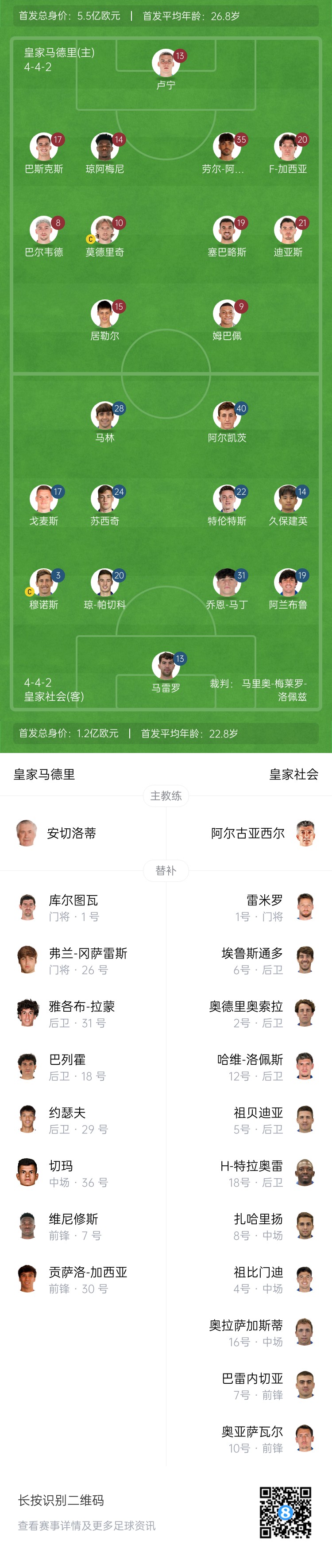 皇马首发:13-卢宁、20-弗兰-加西亚、14-琼阿梅尼、35-劳尔-阿森西奥、17-巴斯克斯、8-巴尔韦德、10-莫德里奇、19-塞巴略斯、15-居勒尔、21-迪亚斯、9-姆巴佩