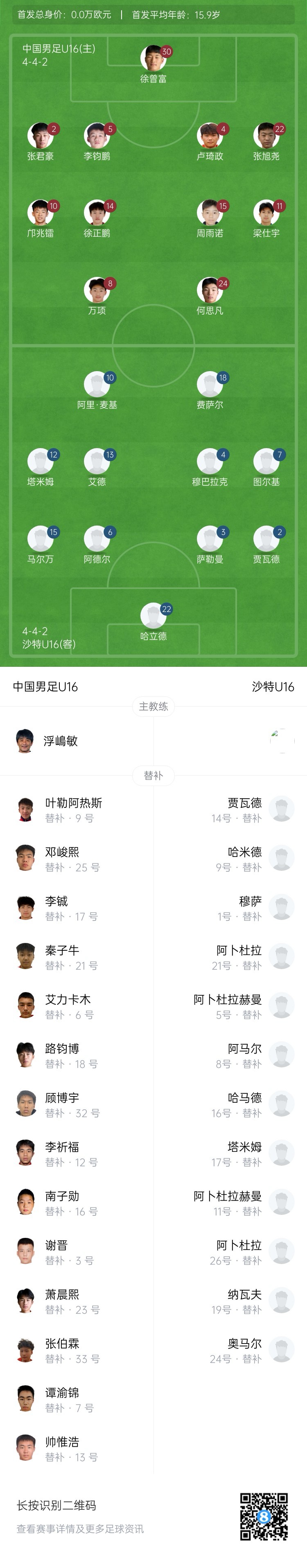 沙特U16首发:22-卡利德-艾尔多萨里、2-贾瓦德-阿尔哈希姆阿尔萨义德、3-萨尔曼-阿尔卡四姆、6-阿德尔-哈尔西、15-马鲁万-艾尔亚米、4-穆巴拉克-艾尔姆斯拉希、13-艾伊德-艾尔沙欣、7-图尔基-艾尔萨义德、12-塔米姆-艾尔卡迪、10-阿里-艾尔马基、18-法耶兹-贝约米