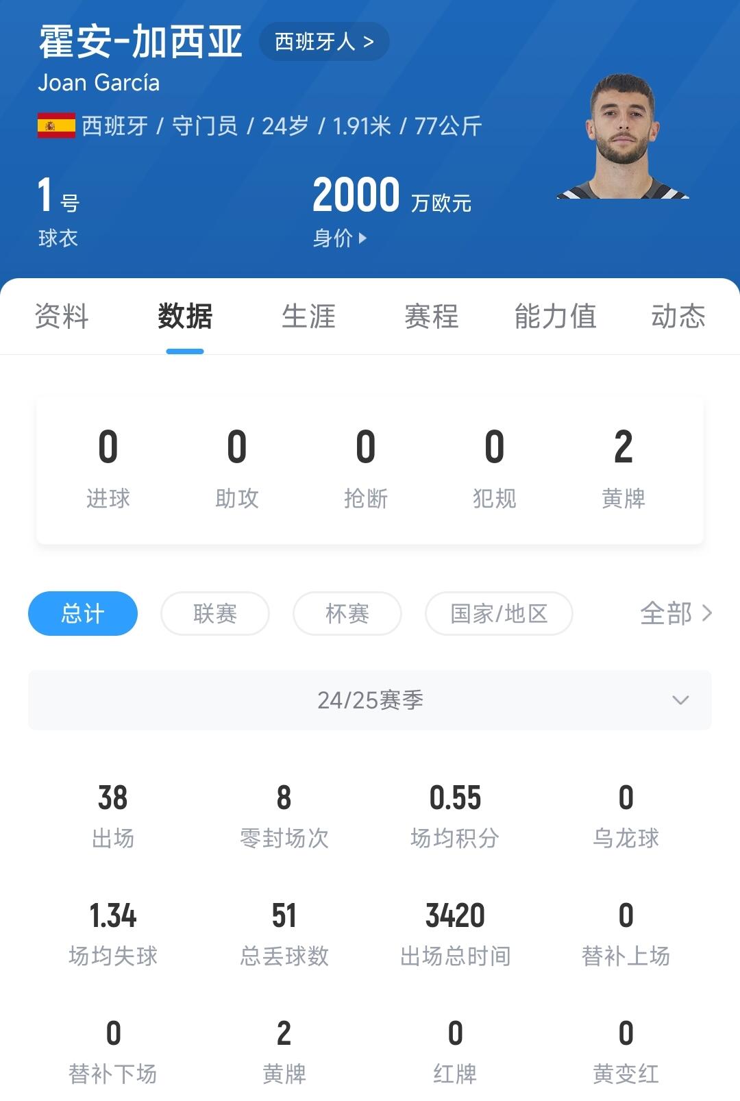 霍安-加西亚是西班牙人青训出身,德转身价目前是2000万欧元。在刚刚过去的赛季中,加西亚代表西班牙人出战38场西甲比赛,丢掉51球,完成8次零封。