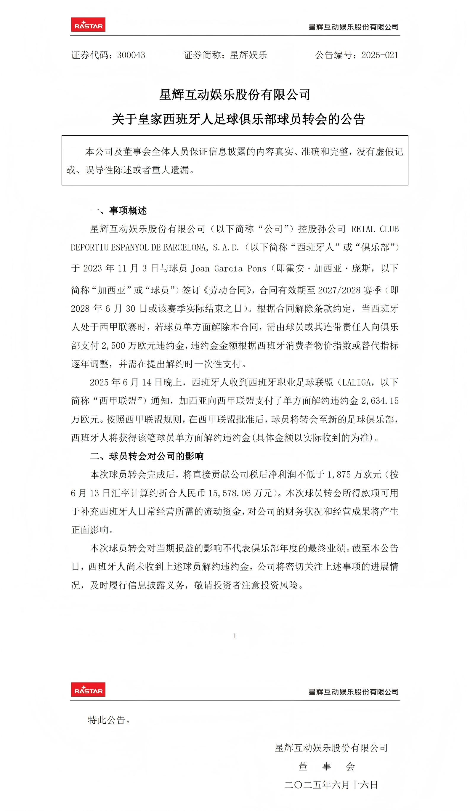 星辉娱乐发布公告,2025年6月14日晚上,西班牙人收到西甲通知,加西亚向西甲支付了单方面解约违约金2634.15万欧元,按照西甲联盟规则,在西甲联盟批准后,球员将转会至新的足球俱乐部,西班牙人将获得该笔球员单方面解约违约金。本次球员转会完成后,将直接贡献公司税后净利润不低于1875万欧元(按6月13日汇率计算约折合人民币15578.06万元)。