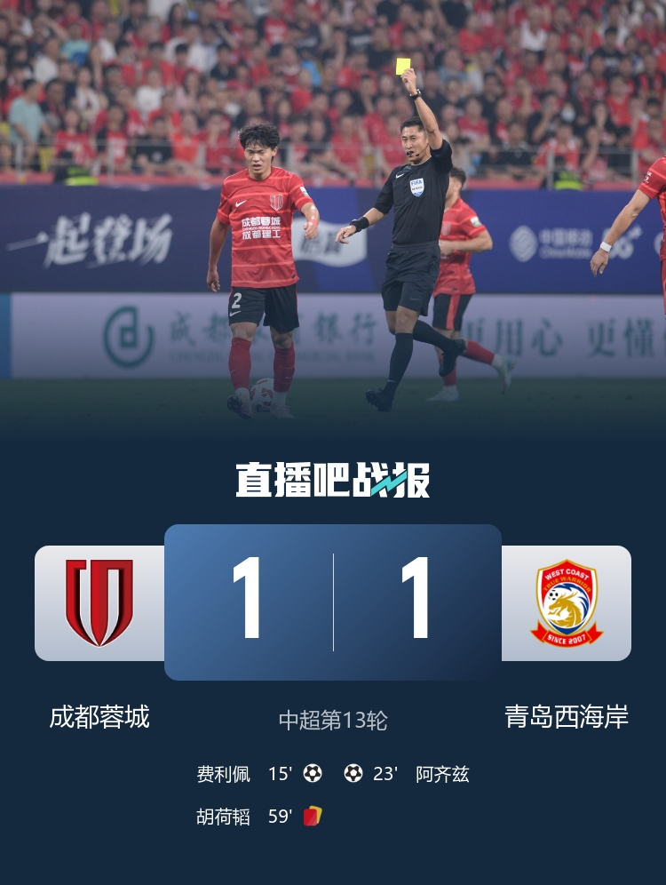 5月17日讯 北京时间5月17日晚上19:35,中超第13轮,成都蓉城坐镇双流体育中心迎战青岛西海岸。上半场,费利佩幸运破门,费利佩造点罗穆洛失点。下半场,胡荷韬2黄变1红,内尔松卢斯一条龙中框。全场结束,成都蓉城1-1青岛西海岸。本场过后,成都蓉城积30分排名第二,青岛西海岸积17分排名第8。